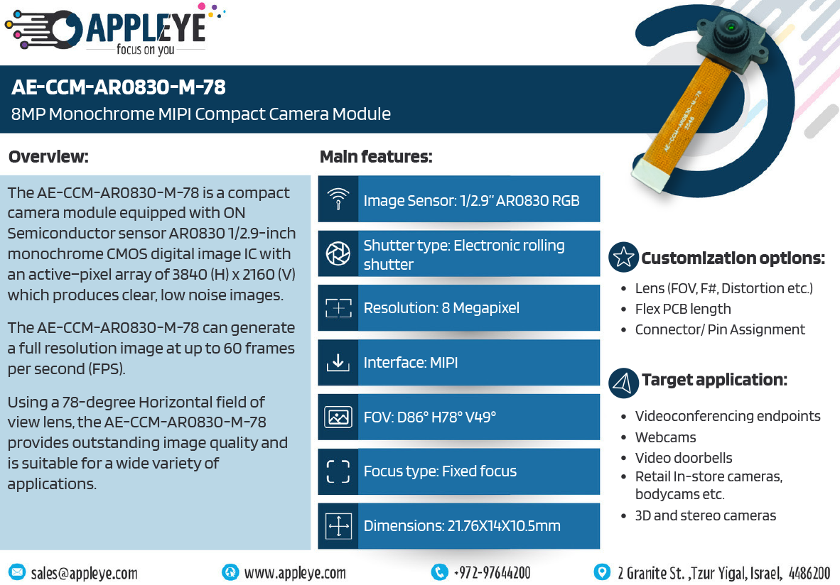 AE-CCM-AR0830-M-78 | 8MP Monochrome MIPI Compact Camera Module