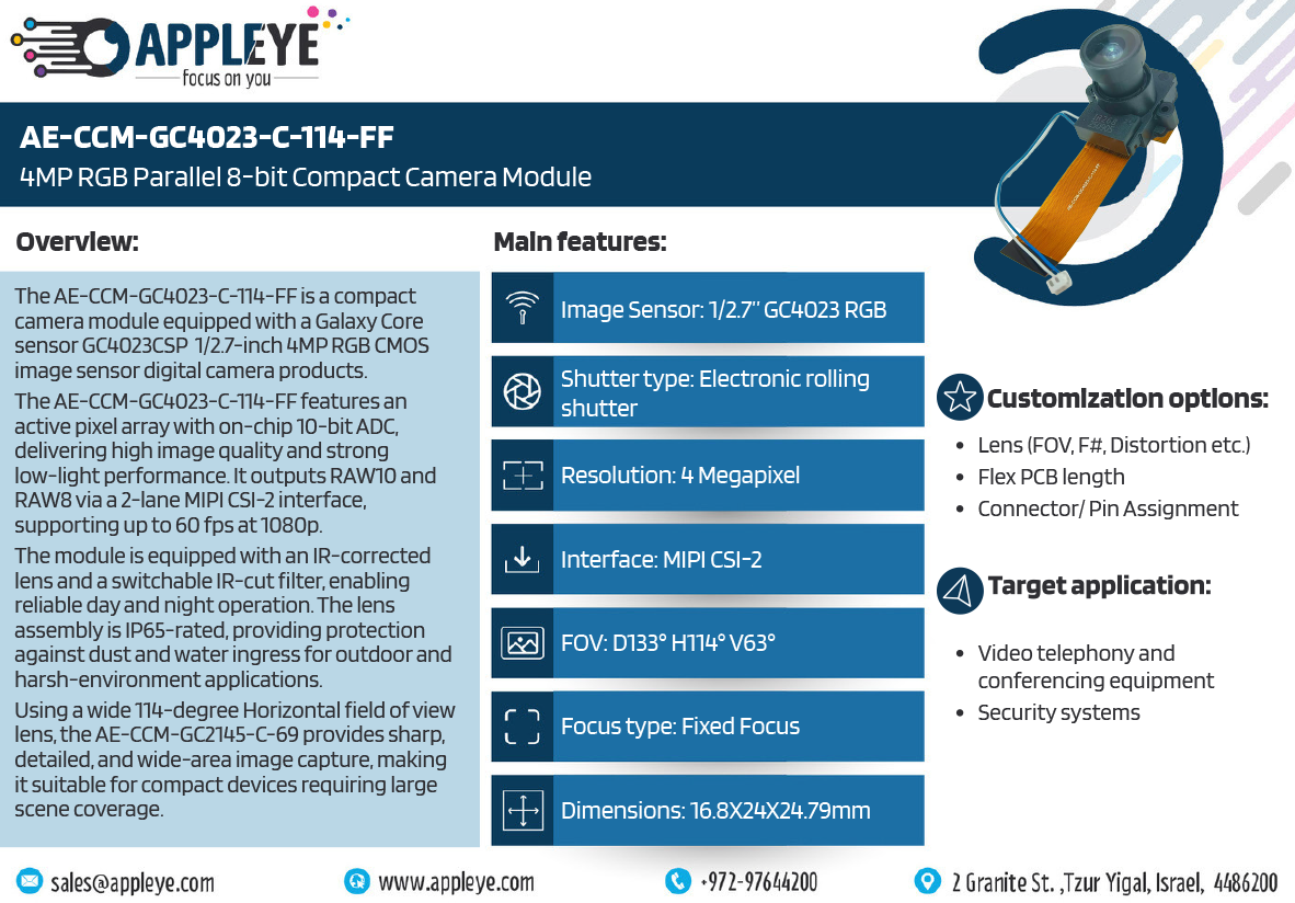 AE-CCM-GC4023-C-114-FF | 4MP RGB Parallel 8-bit Compact Camera Module