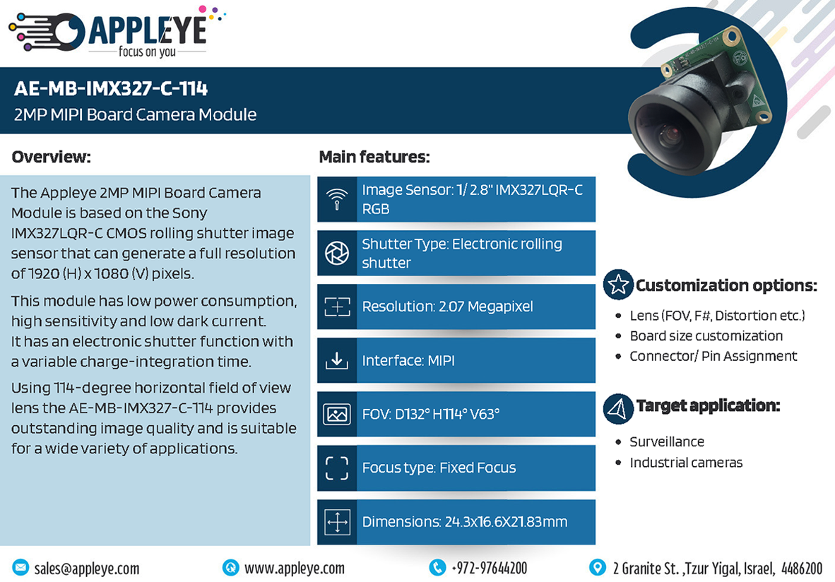 The Appleye 2MP MIPI Board Camera Module is based on the Sony IMX327LQR-C CMOS rolling shutter image sensor that can generate a full resolution of 1920 (H) x 1080 (V) pixels.