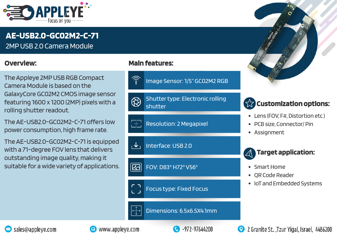 AE-USB2.0-GC02M2-C-71 | 2MP USB 2.0 Camera Module